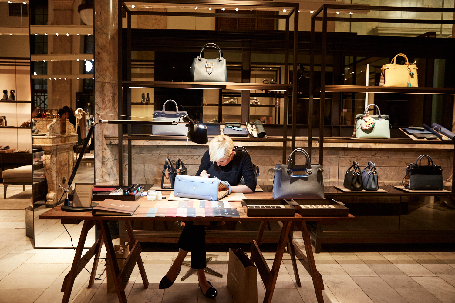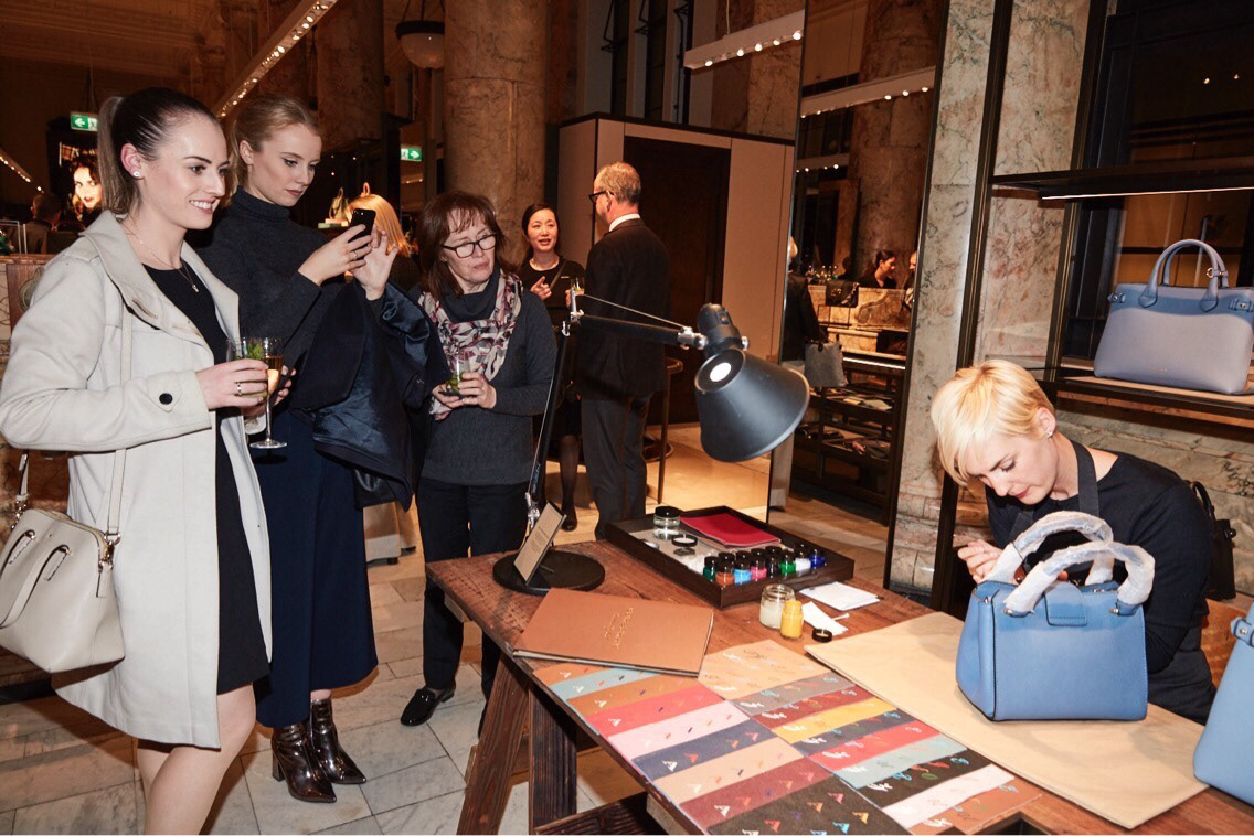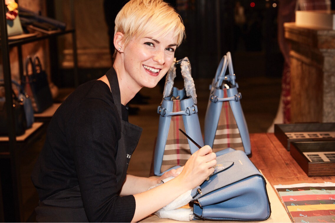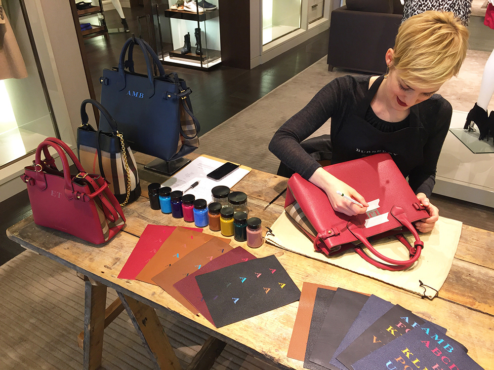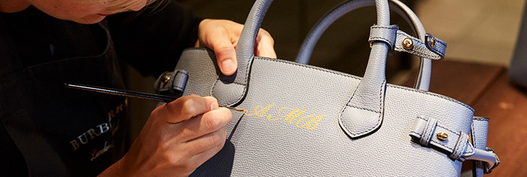 Hand-painted initials on luxury leather handbags, to showcase the skill and craftsmanship of Burberry.