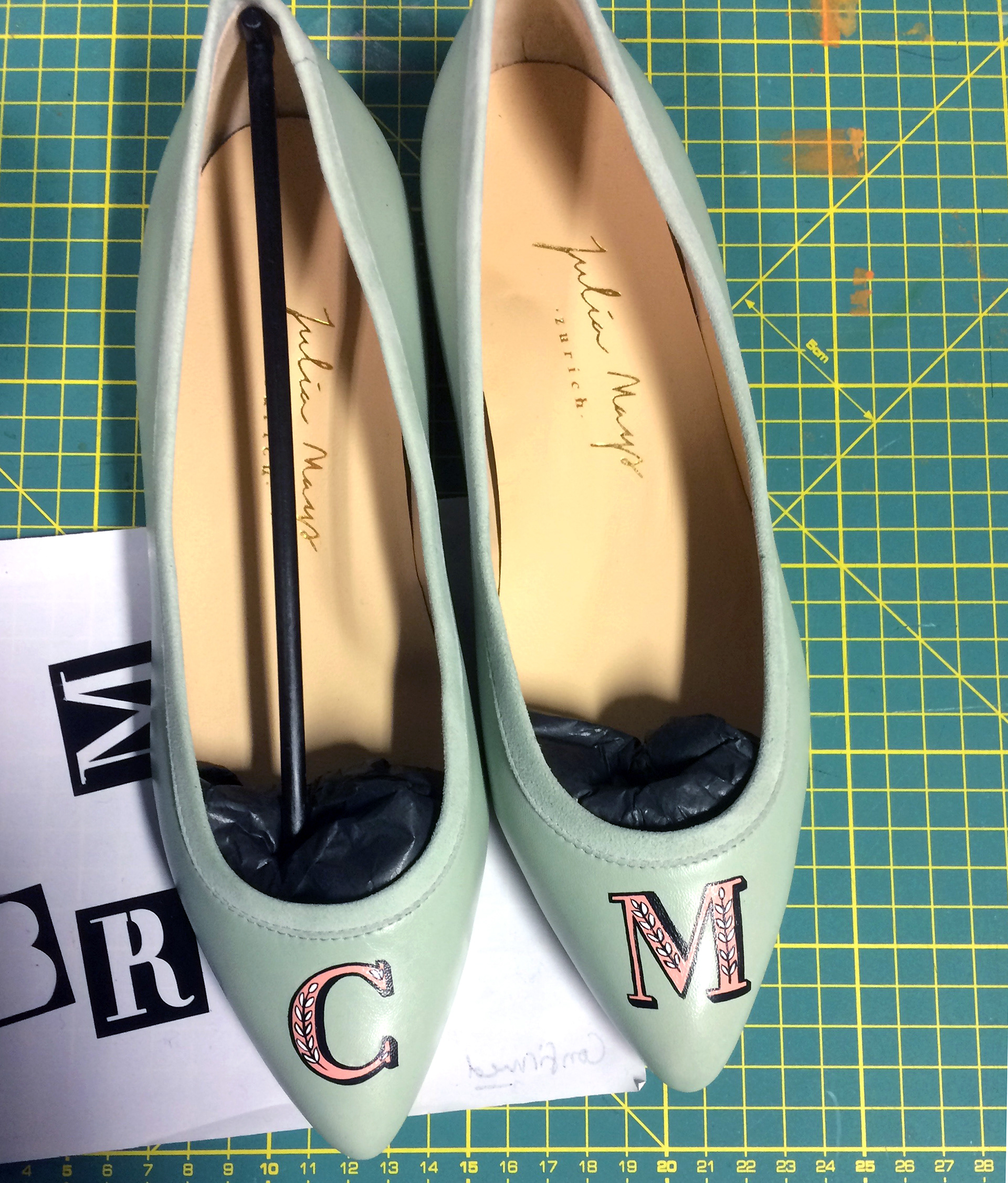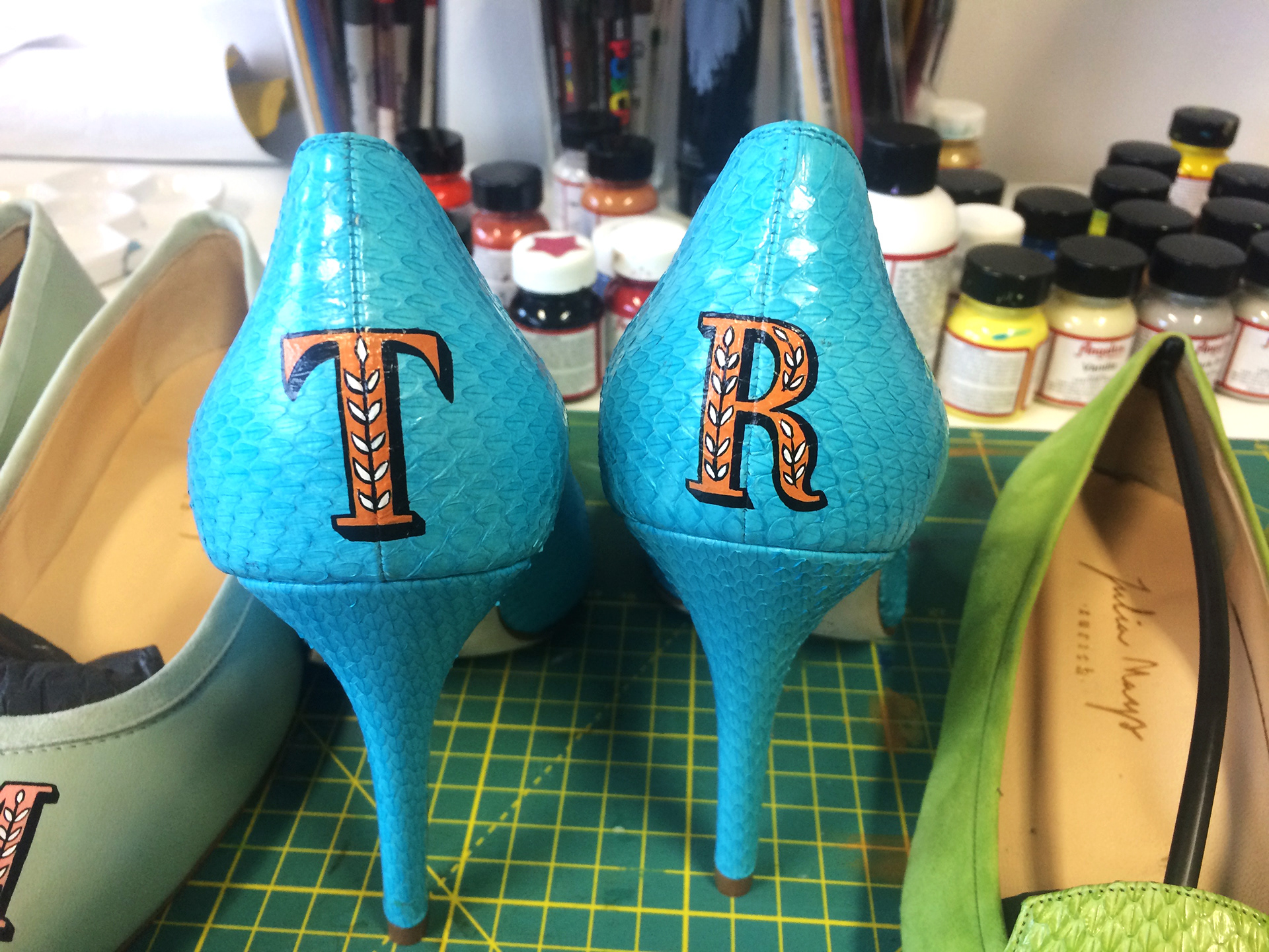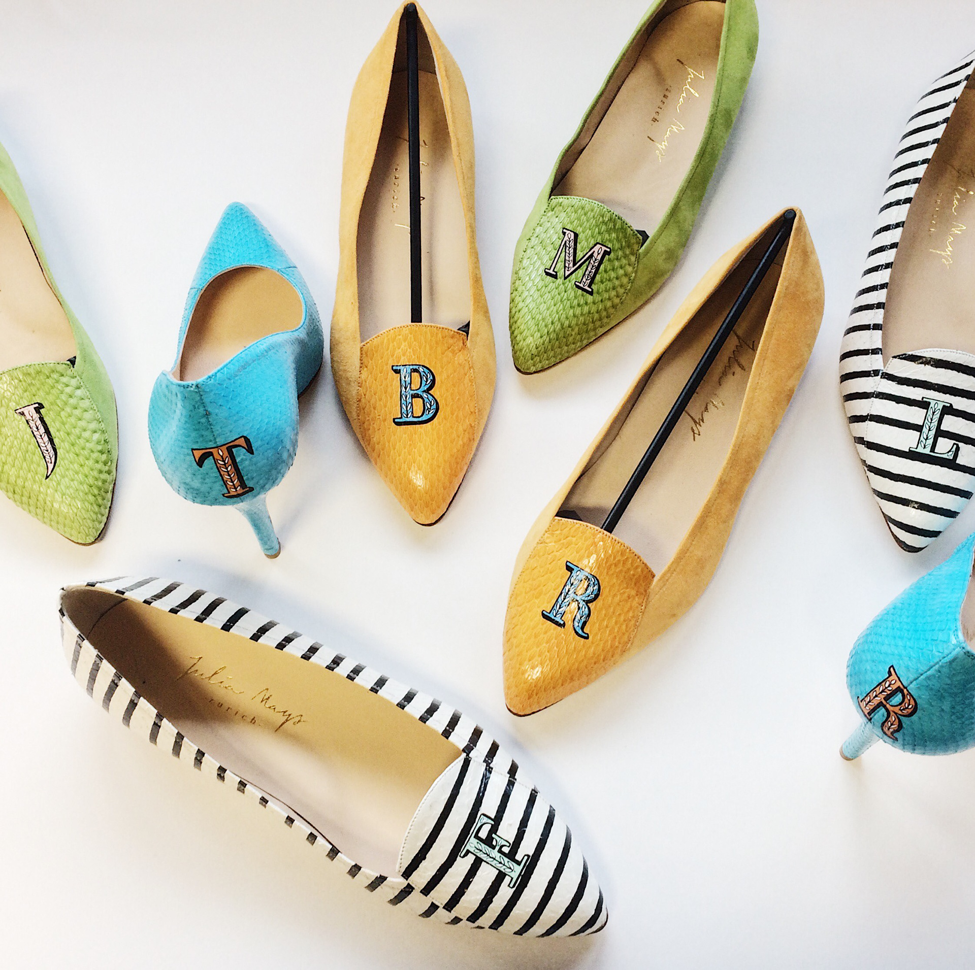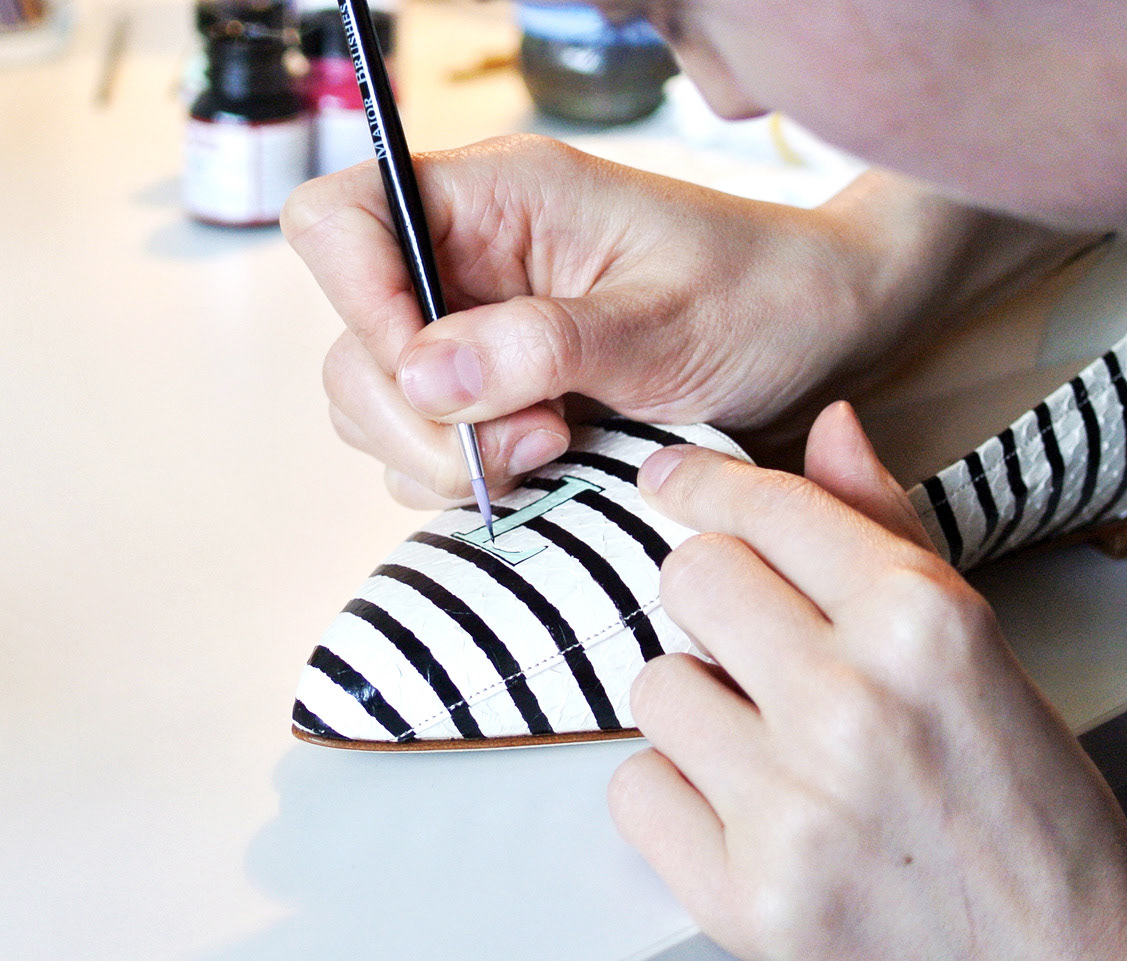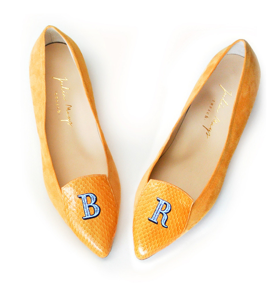 Limited edition, hand-painted monograms on Italian leather shoes for Julia Mays Footwear.