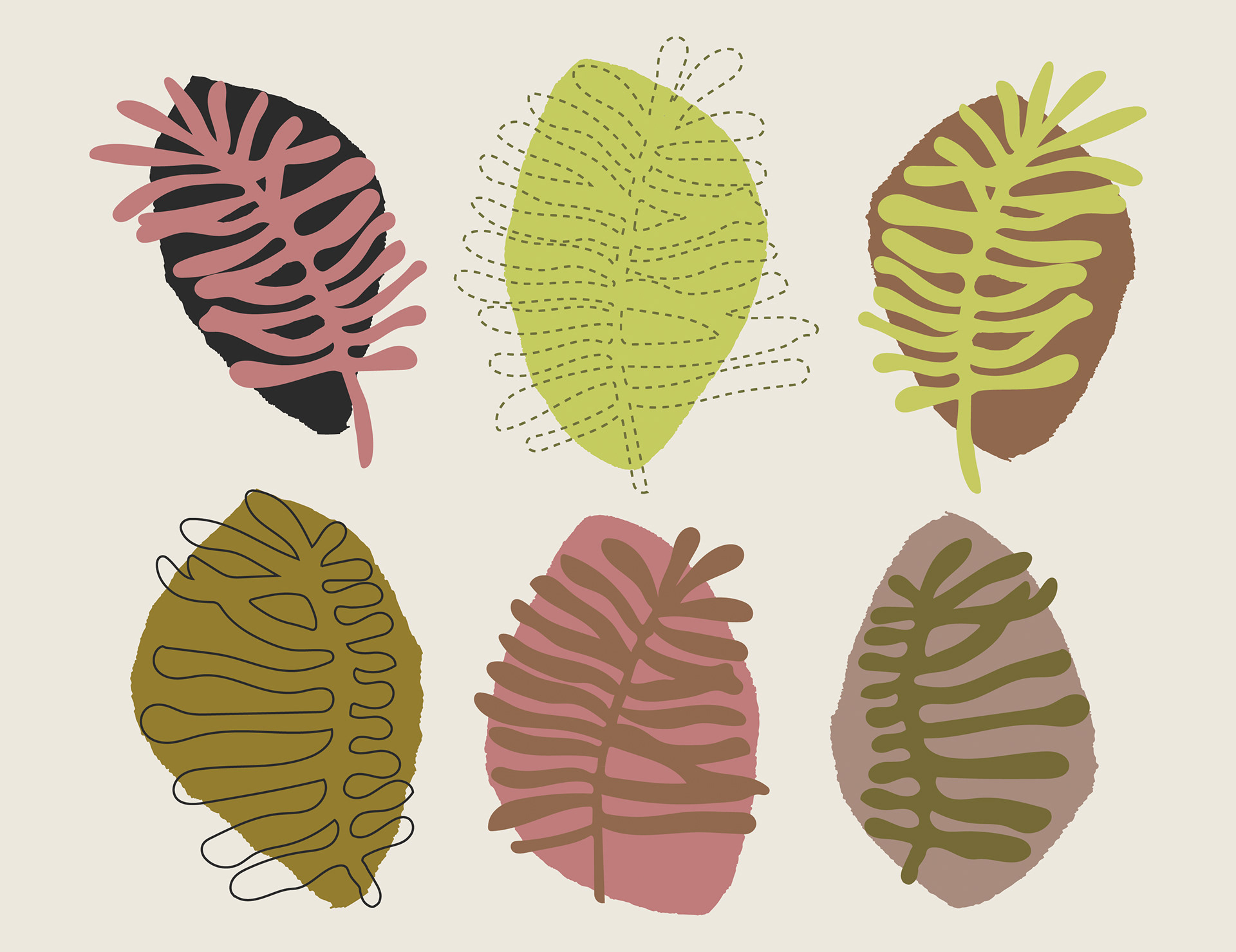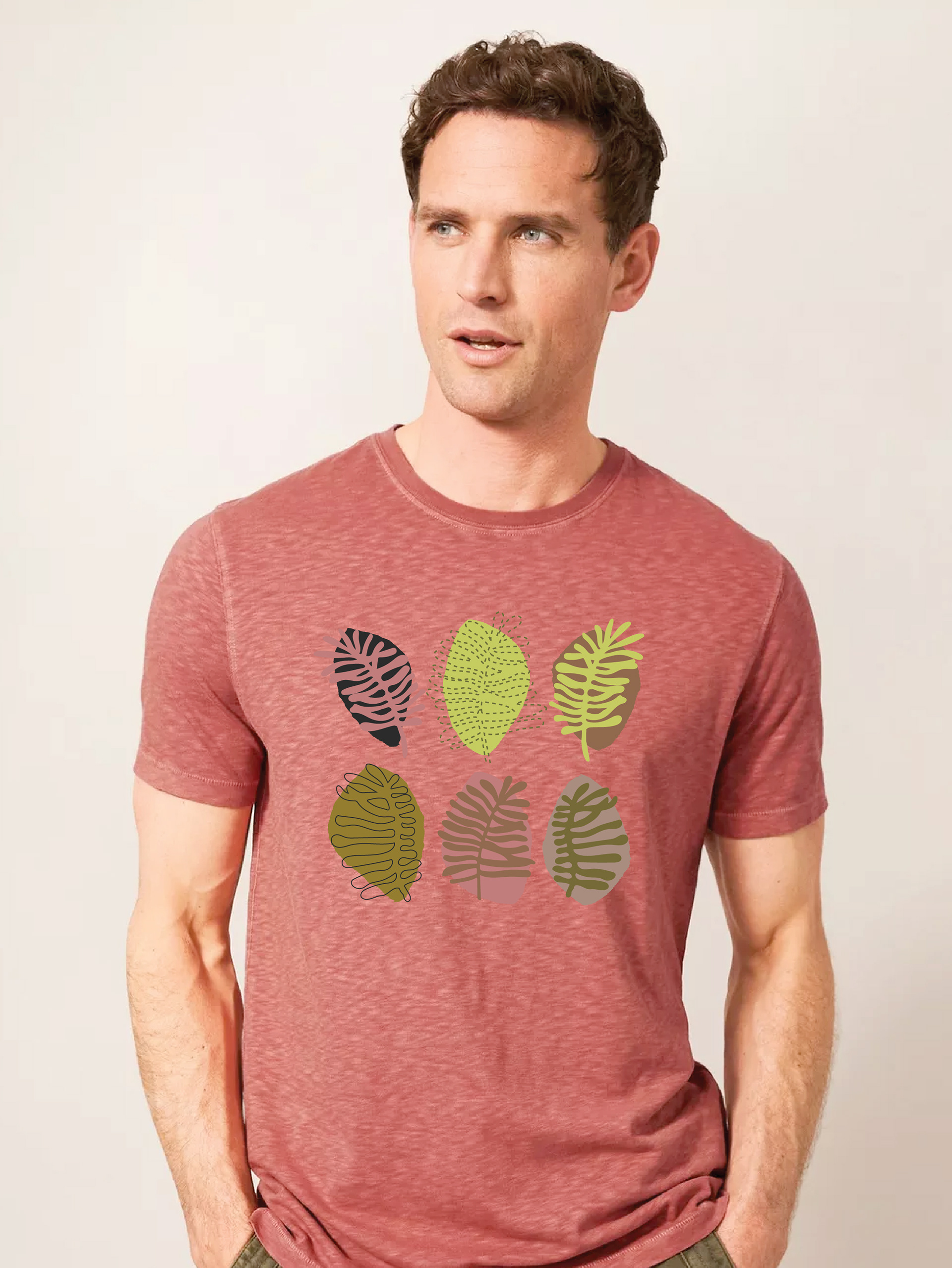 T-shirt graphic for a high street retailer, based on the Majorelle Gardens in Marakesh, using illustrative ink drawing and block colour based on different leaf shapes.