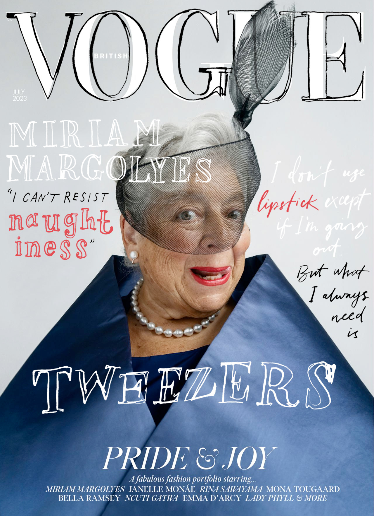 A scratchy and fun application of hand-written lettering on top of this sleek British VOGUE cover featuring the infamous and charming Miriam Margolyes.