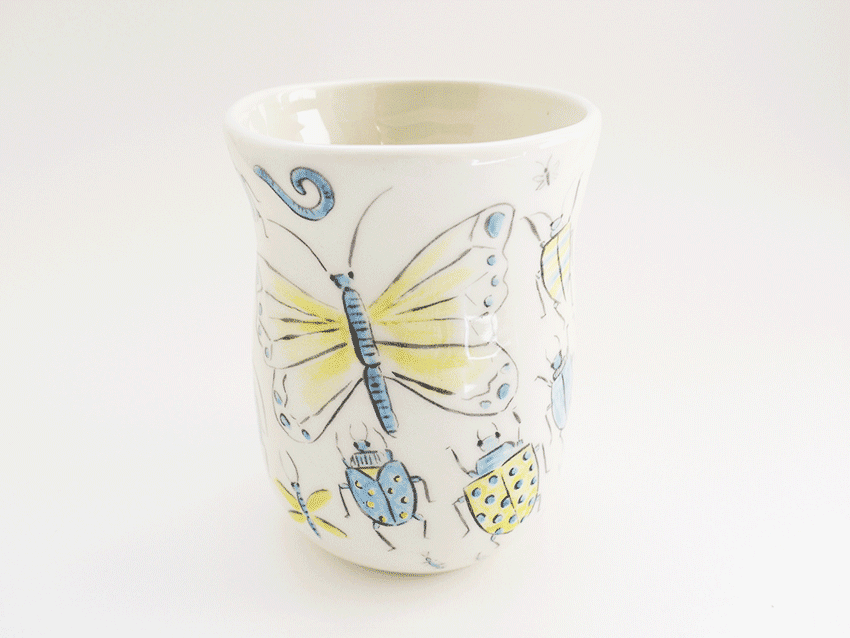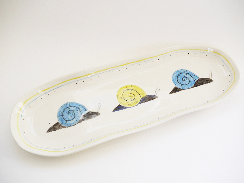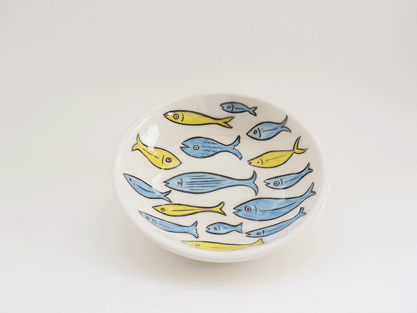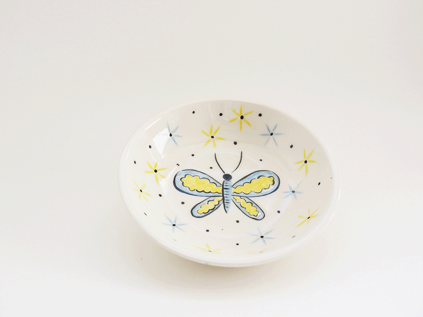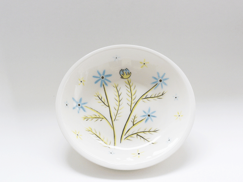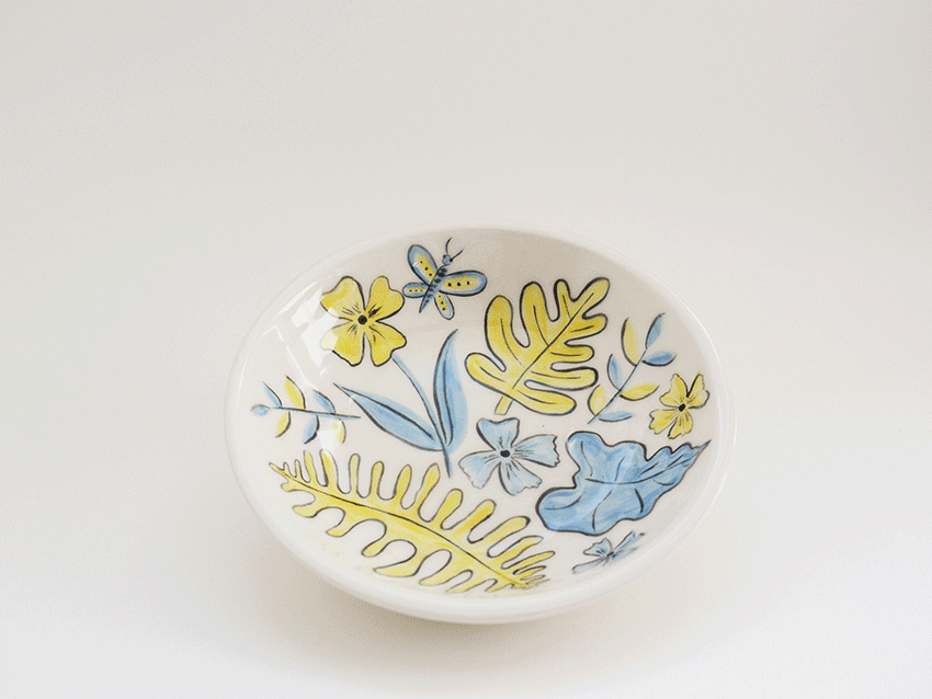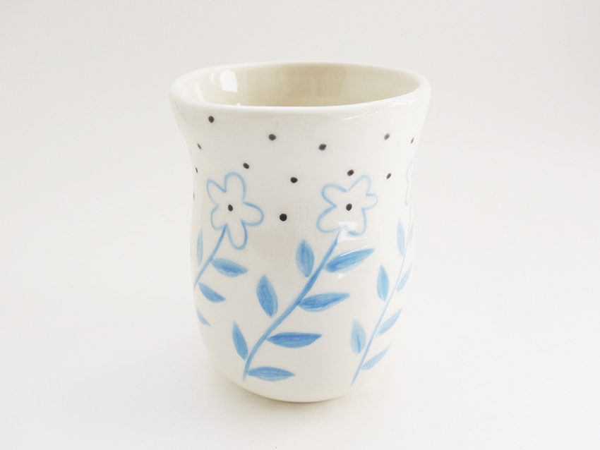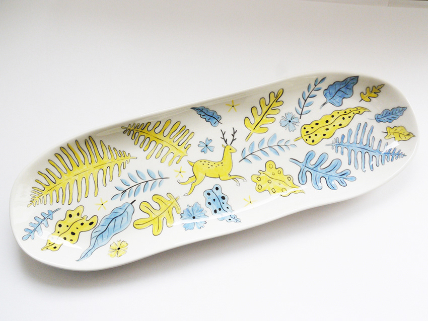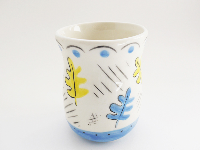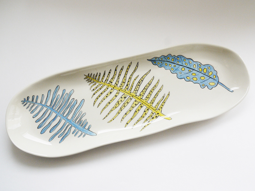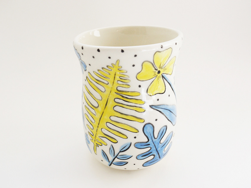 Hand painted patterns and designs in a limited colour palette, on a range of ceramics